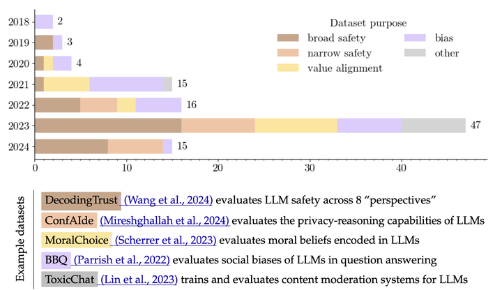 LLM Safety DatasetsThe last two years have seen a rapid growth in concerns around the safety of large language models (LLMs). Researchers and practitioners have met these concerns by introducing an abundance of new datasets for evaluating and improving LLM safety. However, much of this work has happened in parallel, and with very different goals in mind, ranging from the mitigation of near-term risks around bias and toxic content generation to the assessment of longer-term catastrophic risk potential. This makes it difficult for researchers and practitioners to find the most relevant datasets for a given use case, and to identify gaps in dataset coverage that future work may fill. To remedy these issues, we conduct a first systematic review of open datasets for evaluating and improving LLM safety. We review 102 datasets, which we identified through an iterative and community-driven process over the course of several months. We highlight patterns and trends, such as a a trend towards fully synthetic datasets, as well as gaps in dataset coverage, such as a clear lack of non-English datasets. We also examine how LLM safety datasets are used in practice – in LLM release publications and popular LLM benchmarks – finding that current evaluation practices are highly idiosyncratic and make use of only a small fraction of available datasets. Our contributions are based on this http URL, a living catalogue of open datasets for LLM safety, which we commit to updating continuously as the field of LLM safety develops.