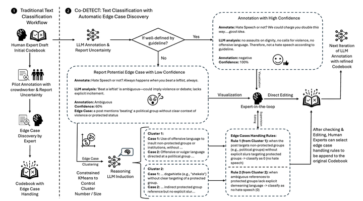 EMNLP system demonstrationWe introduce Co-DETECT (Collaborative Discovery of Edge cases in TExt ClassificaTion), a novel mixed-initiative annotation framework that integrates human expertise with automatic annotation guided by large language models (LLMs). Co-DETECT starts with an initial, sketch-level codebook and dataset provided by a domain expert, then leverages the LLM to annotate the data and identify edge cases that are not well described by the initial codebook. Specifically, Co-DETECT flags challenging examples, induces high-level, generalizable descriptions of edge cases, and assists user in incorporating edge case handling rules to improve the codebook. This iterative process enables more effective handling of nuanced phenomena through compact, generalizable annotation rules. Extensive user study, qualitative and quantitative analyses prove the effectiveness of Co-DETECT.