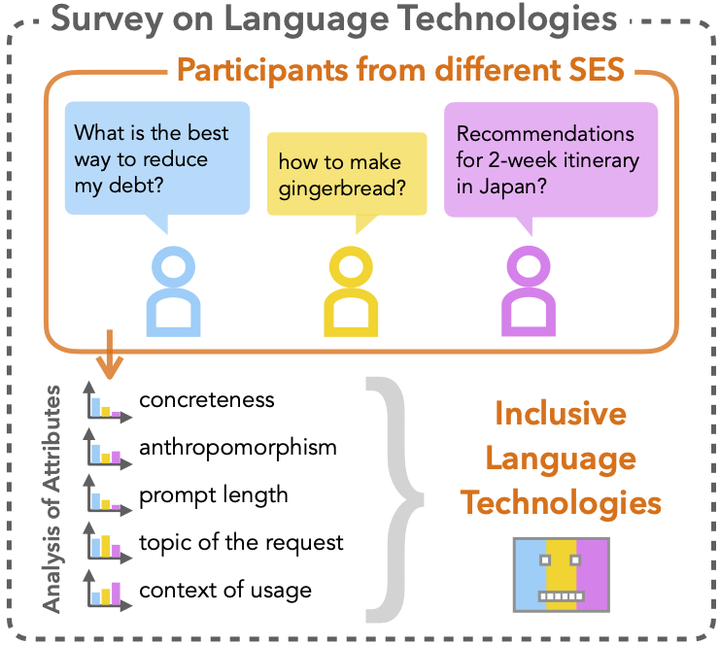 We survey the usage of language technologies among individuals with different SES.Socioeconomic status (SES) fundamentally influences how people interact with each other and, more recently, with digital technologies like large language models (LLMs). While previous research has highlighted the interaction between SES and language technology, it was limited by reliance on proxy metrics and synthetic data. We survey 1,000 individuals from ‘diverse socioeconomic backgrounds’ about their use of language technologies and generative AI, and collect 6,482 prompts from their previous interactions with LLMs. We find systematic differences across SES groups in language technology usage (i.e., frequency, performed tasks), interaction styles, and topics. Higher SES entail a higher level of abstraction, convey requests more concisely, and topics like ‘inclusivity’ and ‘travel’. Lower SES correlates with higher anthropomorphization of LLMs (using ”hello” and ”thank you”) and more concrete language. Our findings suggest that while generative language technologies are becoming more accessible to everyone, socioeconomic linguistic differences still stratify their use to create a digital divide. These differences underscore the importance of considering SES in developing language technologies to accommodate varying linguistic needs rooted in socioeconomic factors and limit the AI Gap across SES groups.