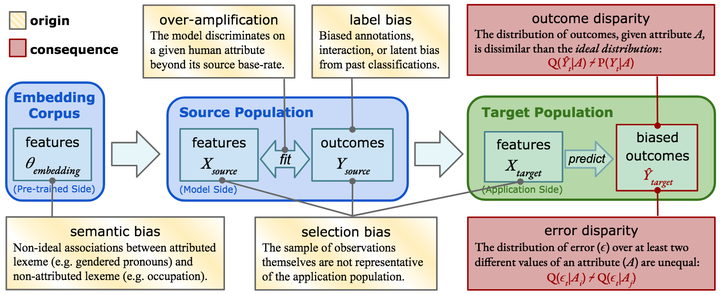 Sources and Types of Predictive BiasesAn increasing number of natural language processing papers address the effect of bias on predictions, introducing mitigation techniques at different parts of the standard NLP pipeline (data and models). However, these works have been conducted individually, without a unifying framework to organize efforts within the field. This situation leads to repetitive approaches, and focuses overly on bias symptoms/effects, rather than on their origins, which could limit the development of effective countermeasures. In this paper, we propose a unifying predictive bias framework for NLP. We summarize the NLP literature and suggest general mathematical definitions of predictive bias. We differentiate two consequences of bias: outcome disparities and error disparities, as well as four potential origins of biases: label bias, selection bias, model overamplification, and semantic bias. Our framework serves as an overview of predictive bias in NLP, integrating existing work into a single structure, and providing a conceptual baseline for improved frameworks.