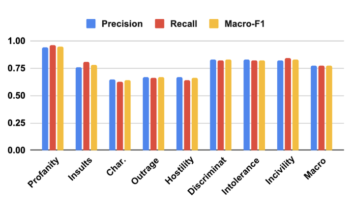 Performance per categoryWell-annotated data is a prerequisite for good Natural Language Processing models. Too often, though, annotation decisions are governed by optimizing time or annotator agreement. We make a case for nuanced efforts in an interdisciplinary setting for annotating offensive online speech. Detecting offensive content is rapidly becoming one of the most important real-world NLP tasks. However, most datasets use a single binary label, e.g., for hate or incivility, even though each concept is multi-faceted. This modeling choice severely limits nuanced insights, but also performance.We show that a more fine-grained multi-label approach to predicting incivility and hateful or intolerant content addresses both conceptual and performance issues.We release a novel dataset of over 40,000 tweets about immigration from the US and UK, annotated with six labels for different aspects of incivility and intolerance.Our dataset not only allows for a more nuanced understanding of harmful speech online, models trained on it also outperform or match performance on benchmark datasets