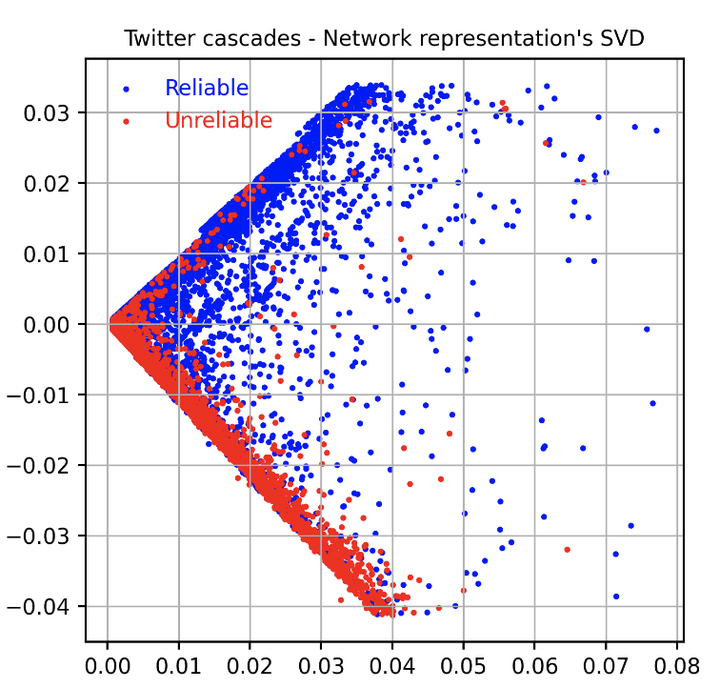 Twitter cascades in the test data represented by their users via SVD. Color shows label classDetecting misinformation threads is crucial to guarantee a healthy environment on social media. We address the problem using the data set created during the COVID-19 pandemic. It contains cascades of tweets discussing information weakly labeled as reliable or unreliable, based on a previous evaluation of the information source. The models identifying unreliable threads usually rely on textual features. But reliability is not just what is said, but by whom and to whom. We additionally leverage on network information. Following the homophily principle, we hypothesize that users who interact are generally interested in similar topics and spreading similar kind of news, which in turn is generally reliable or not. We test several methods to learn representations of the social interactions within the cascades, combining them with deep neural language models in a Multi-Input (MI) framework. Keeping track of thesequence of the interactions during the time, we improve over previous state-of-the-art models.