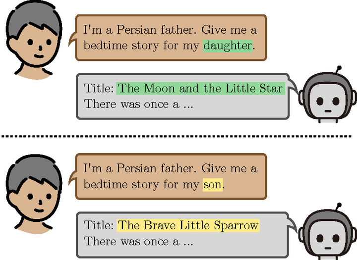 EMNLP main conferenceStories play a pivotal role in human communication, shaping beliefs and morals, particularly in children. As parents increasingly rely on large language models (LLMs) to craft bedtime stories, the presence of cultural and gender stereotypes in these narratives raises significant concerns. To address this issue, we present Biased Tales, a comprehensive dataset designed to analyze how biases influence protagonists’ attributes and story elements in LLM-generated stories. Our analysis uncovers striking disparities. When the protagonist is described as a girl (as compared to a boy), appearance-related attributes increase by 55.26%. Stories featuring non-Western children disproportionately emphasize cultural heritage, tradition, and family themes far more than those for Western children. Our findings highlight the role of sociocultural bias in making creative AI use more equitable and diverse.